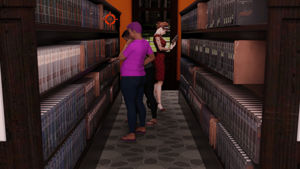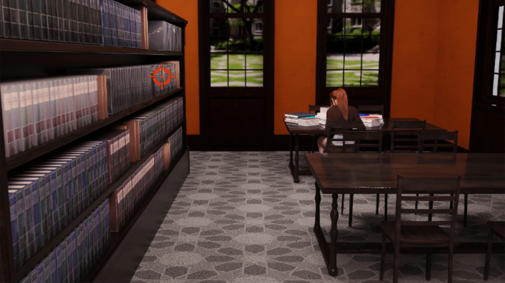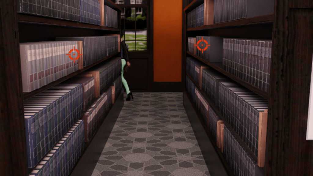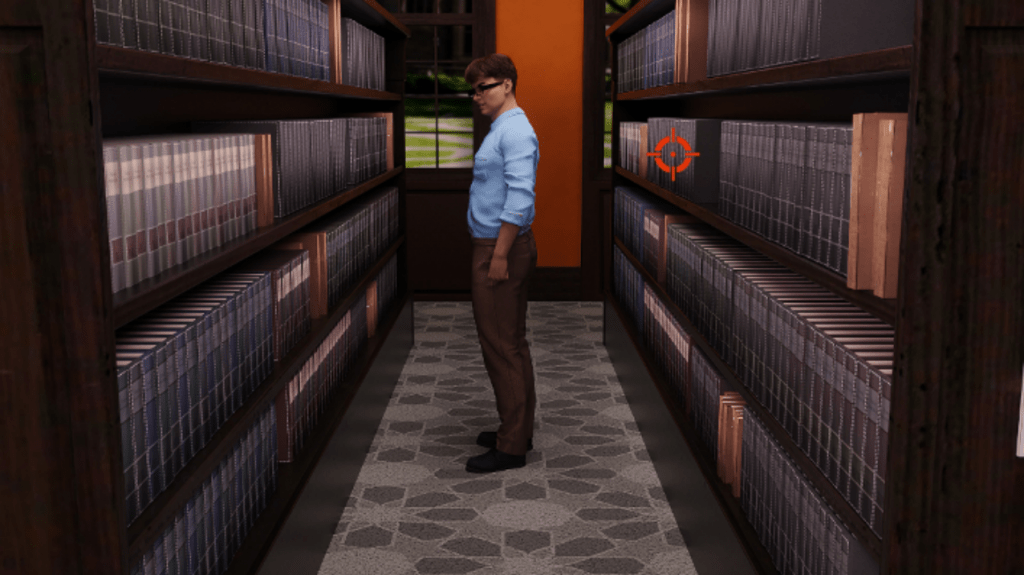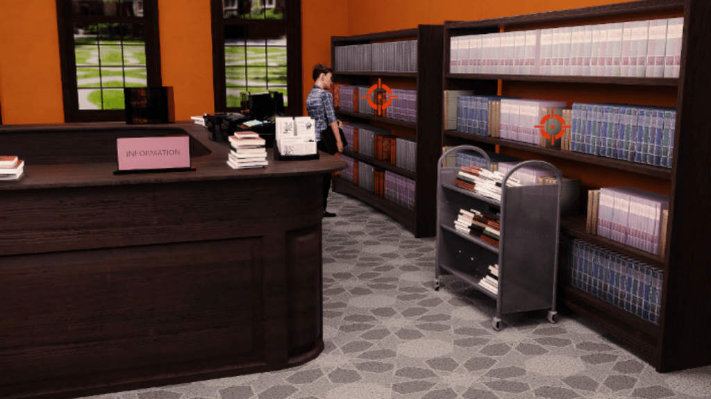 По сюжету вы окажетесь в библиотеке и во время свободного перемещения, если нажать на тележку с книгами, то будет возможность расставить их по полкам. Нужно будет расставить 5 книг. В игре 11 мест где можно поставить книги, при каждом прохождении выбираются 5 случайных из них. Прикладываю скриншоты возможных позиций