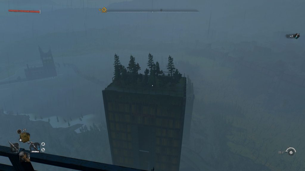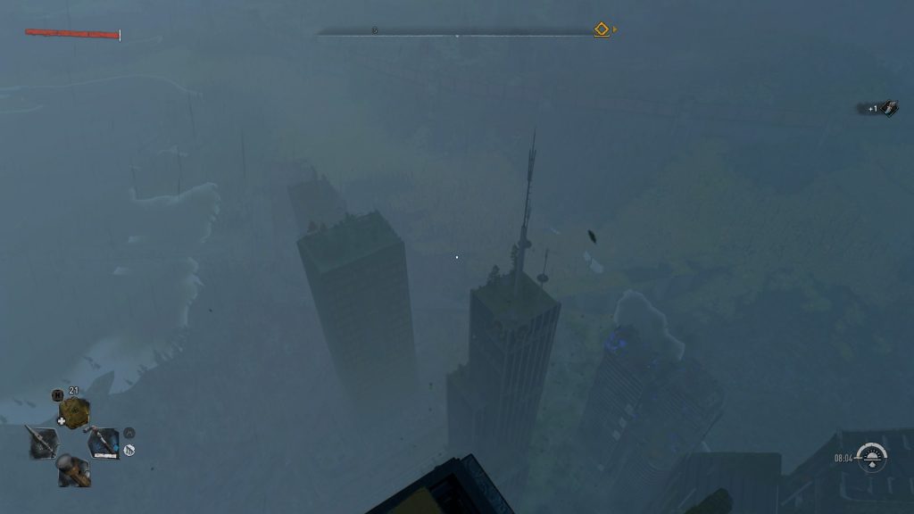 Находясь на крыше самого высокого здания, нужно подойти к краю, чтобы был такой же вид как на скриншоте. Прыгаем на правое здание, используя параплан (если улучшить параплан, то можно долететь без всяких трудностей, но можно и на 1 лвл). На этой крыше будет ящик с ништяками, можно залутать.