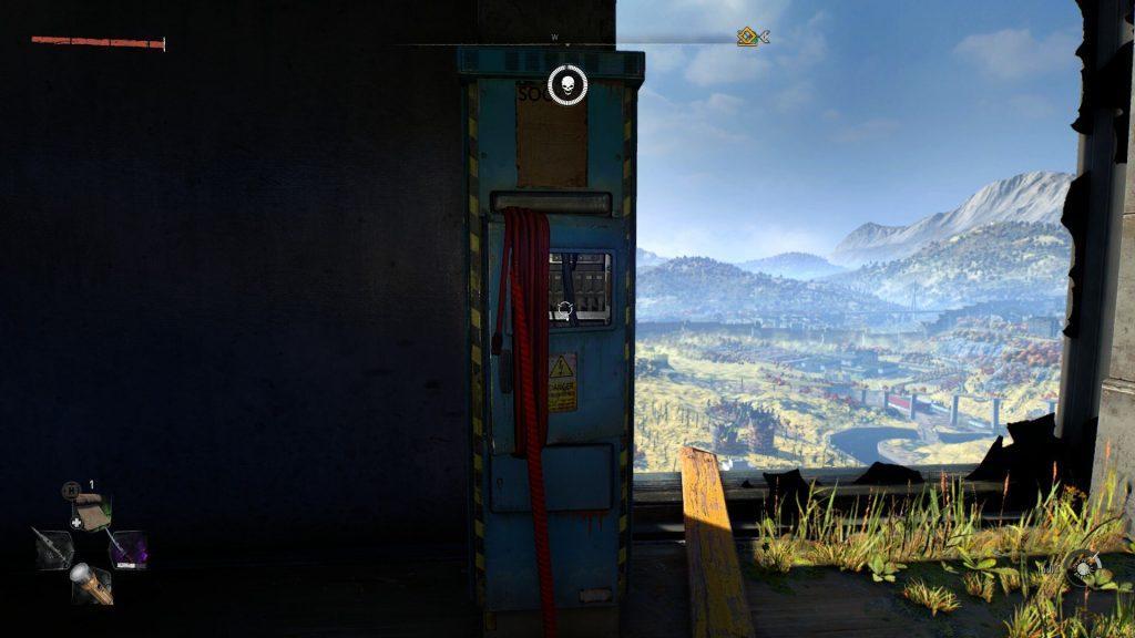 Когда мы попали на крышу, нужно найти эл. щиток. Берем провод и идем к желтой доске.