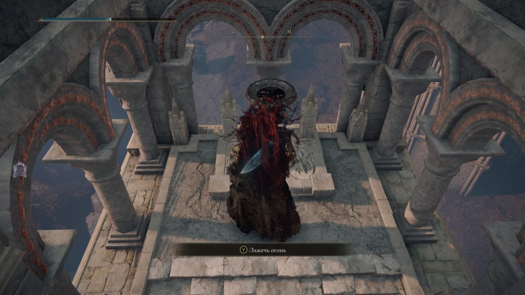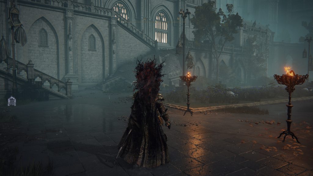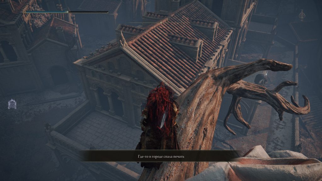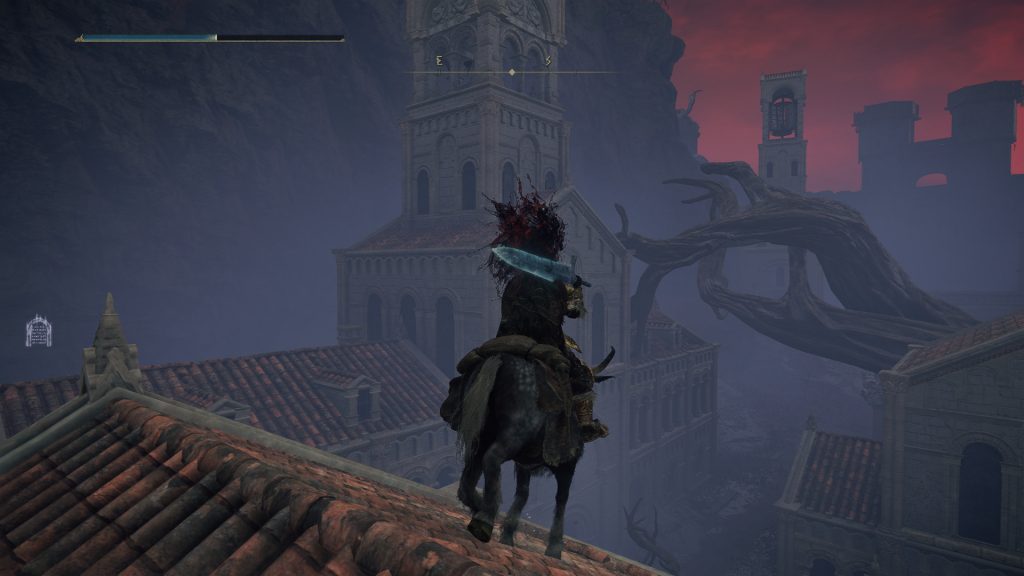 Выходите из здания на север. Добравшись до внутреннего двора, поверните налево и взберитесь по щебню у дальней стены. Затем продолжайте подниматься по лестнице мимо врагов, использующих магию, и перепрыгните через перила слева на лестницу внизу. Продолжайте подниматься по короткому лестничному пролёту и поверните налево за угол, мимо ещё одного волшебника. Снова перепрыгните через перила на крышу.