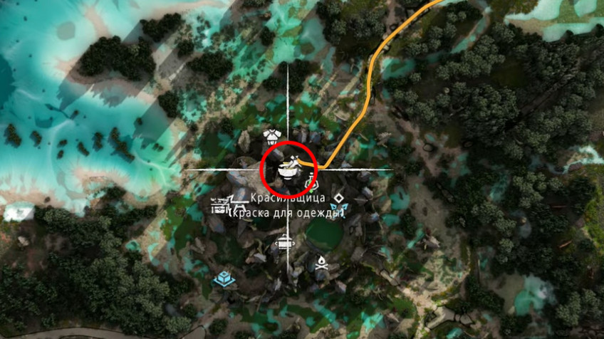 А всё дело в том, что для того, чтобы покрасить лицо Элой, необходимо воспользоваться услугами художников. Это особые торговцы, которых можно обнаружить в поселениях. На карте они обозначаются символом в виде татуировочной иглы (см. скриншот ниже). Такого NPC можно будет обнаружить в Бастионе, Терновой Топи и Обжигающем Копье. Чтобы получить возможность пользоваться услугами такого человека, придётся сперва выполнить его квест.