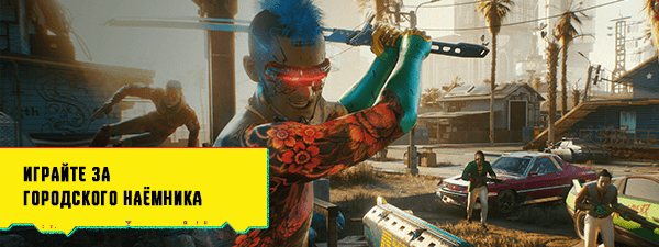 ИГРАЙТЕ ЗА ГОРОДСКОГО НАЁМНИКА Станьте киберпанком — оснащённым имплантами наёмником — и сделайте себе имя на улицах Найт-Сити