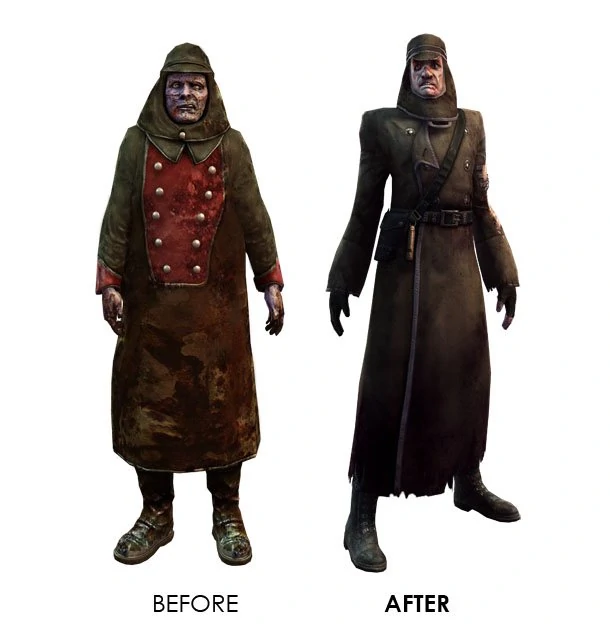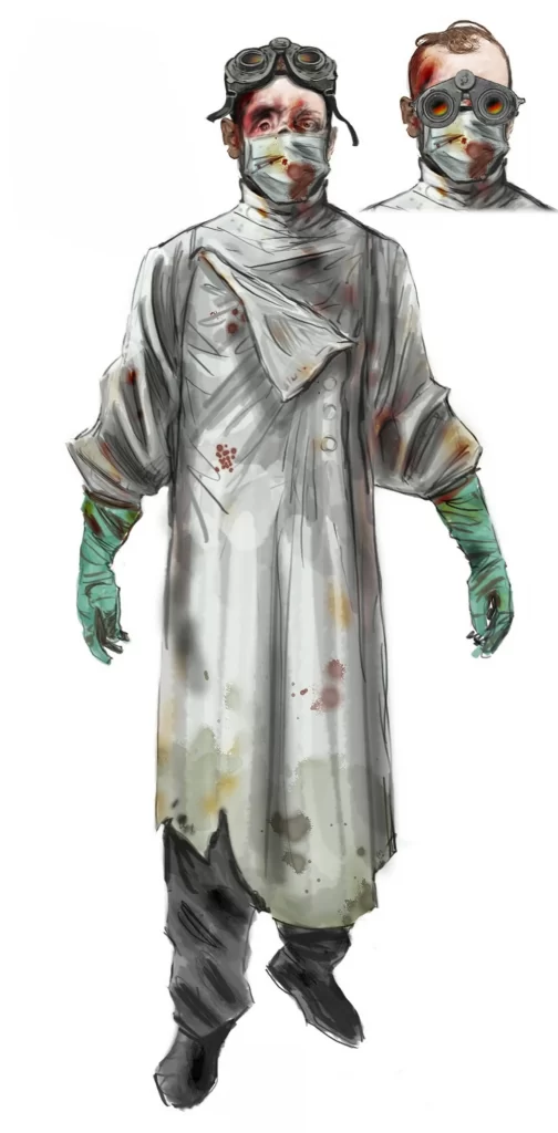 Модель 5: Эта модель носит комбинезон оливкового цвета, синюю рубашку и черные перчатки с желтоватой отделкой. Его “маска для лица” – имеет пятнистый, красноватый цвет, а остальная часть его лица выглядит так, как будто она была сожжена. Все его тело испачкано пятнами ржавого цвета. Его волосы, в отличие от других моделей, каштановые.
