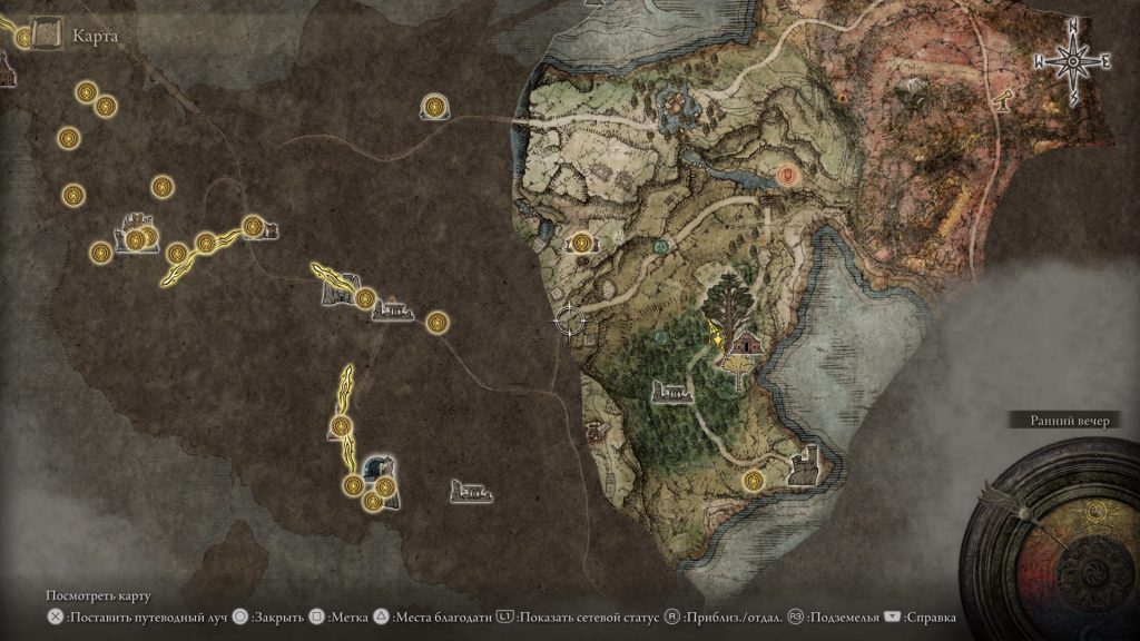 Главное же и самое важное новшество Elden Ring, которое вызывало больше всего сомнений среди поклонников soulsborne, — это переход от закрытых камерных локаций к полномасштабному открытому миру. Спустя приблизительно пять часов геймплея, после первой победы над владельцем одного из осколков кольца, авторы отпускают игрока в свободное путешествие по Междуземью. Для прогресса по сюжету некоторые задания всё-таки придётся выполнять в определённом порядке, но в целом разработчики стараются лишний раз не отбирать свободу действий без необходимости — невидимых стен и других назойливых условностей я не заметил. Во многие ключевые локации можно попасть несколькими способами, причём иногда по чистой случайности. Я потратил целый вечер на поиски ключа для запечатанных врат академии волшебства и только потом понял, что всё это время неправильно толковал клочок карты, где нарисовано расположение тайника. Зато в процессе объездил и нашёл множество мест, которые иначе наверняка бы обошёл стороной, поэтому препятствие не ощущалось безвыходным тупиком. Elden Ring никогда не вынуждает игрока чувствовать себя взаперти. Если где-то не получается отыскать путь вперёд, всегда можно отправиться куда-нибудь ещё, чтобы набраться сил и опыта, — благо возможностей предостаточно.