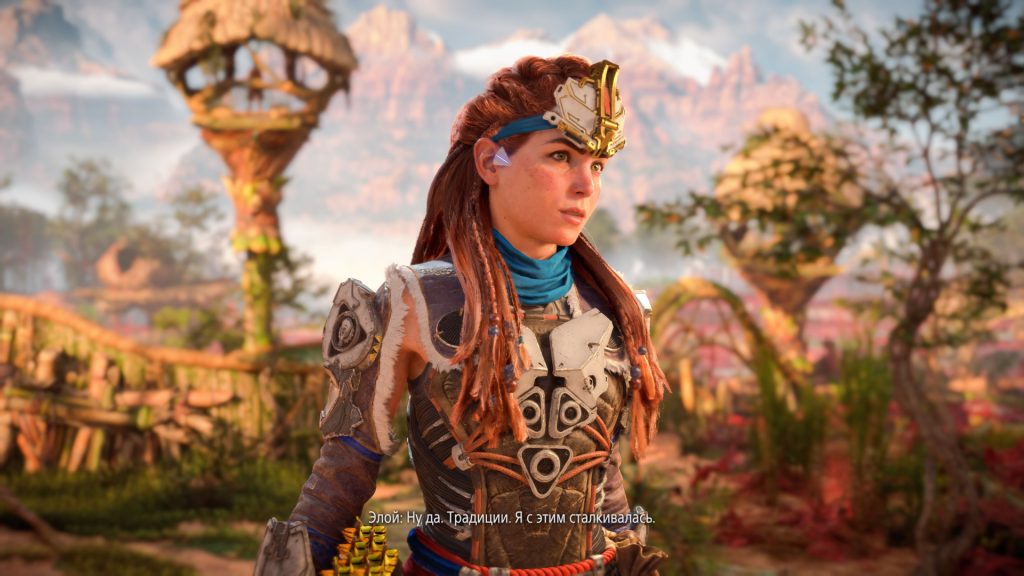 Посредственность сюжета компенсирует ещё и качество режиссуры. Даже вне основной сюжетной линии нередко встречаются хорошо поставленные диалоги, мимика и жестикуляция персонажей часто удивляет проработкой. Про пейзажи и говорить нечего: они и в Zero Dawn были потрясающими, а тут вообще выше всяких похвал. Также разработчики из Guerrilla Games мастерски освоили тонкости отдачи геймпада DualSense. Действия Элой всегда сопровождаются грамотно подобранной вибрацией контроллера, которая зачастую заметно помогает в бою. Взмахи копья, натяжение тетивы — всё это в полной мере ощущается и глазами, и ушами, и руками.