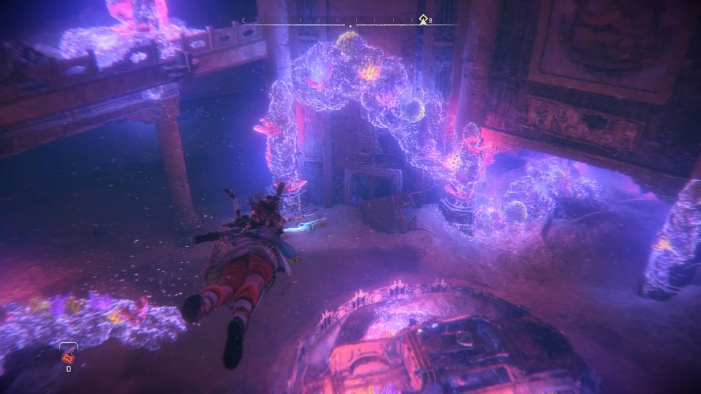 В опциональных подземельях Forbidden West походит на последние игры о Ларе Крофт: нужно таскать ящики, дотягиваться до труднодосягаемых мест, рушить стены и искать рычаги. Элой внезапно научилась плавать, но под водой она беззащитна, так что ей приходится прятаться в кущах водорослей — прямо как в Shadow of the Tomb Raider