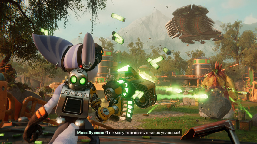 Впрочем, сюжет никогда не стоял у Ratchet & Clank в приоритете: на диалоги подчас просто не успеваешь отвлекаться, уворачиваясь от сгустков вражеской плазмы. В этом смысле «Сквозь миры» ни на секунду не роняет планку, заданную предшественницами. Перестрелки проходят быстро, шумно и неизменно увлекательно. Главную заповедь франшизы — оружия всегда должно быть больше, чем патронов, — разработчики сохранили в целости. На поздних этапах боезапас тает за считанные секунды, и по ходу одного-единственного сражения легко можно разменять добрый десяток разных стволов. Арсенал «Сквозь миры» — сбалансированная и в меру забавная подборка из нового оружия, старого и старого-под-новыми-именами. От того, что снайперская винтовка теперь называется «Башколом», а не «Плазмобой», ничего не поменялось. А вот новинки часто умиляют своей креативностью: «Ороситель» превращает врагов в зелёные скульптуры, «Рикошет» в случае удачного попадания ещё несколько секунд продолжает дубасить цель, а депрессивный летающий гриб «Мистер Антигруздь» хриплыми окриками отвлекает противника на себя. В сравнении с Ratchet & Clank (2016) новой игре сильно недостает грувитрона и овценатора — лучших гаджетов за всю историю серии. Зато зачем-то оставили пиломёт, который никогда не был особо эффективным. Прокачка идёт на удивление быстро: в течение одной миссии (то есть примерно за час-полтора) вполне можно довести избранное оружие до максимального уровня и накопить ресурсов на покупку ключевых апгрейдов. А значит, пора переключаться на следующее! Разработчики всеми правдами и неправдами мотивируют игроков менять тактику, даже если поначалу что-то кажется нелепым. Не стоит недооценивать слаженную атаку «Антигруздя» и кусачих мини-роботов «Агентов Рока» на босса — особенно если заранее превратить его в изящный кустик.