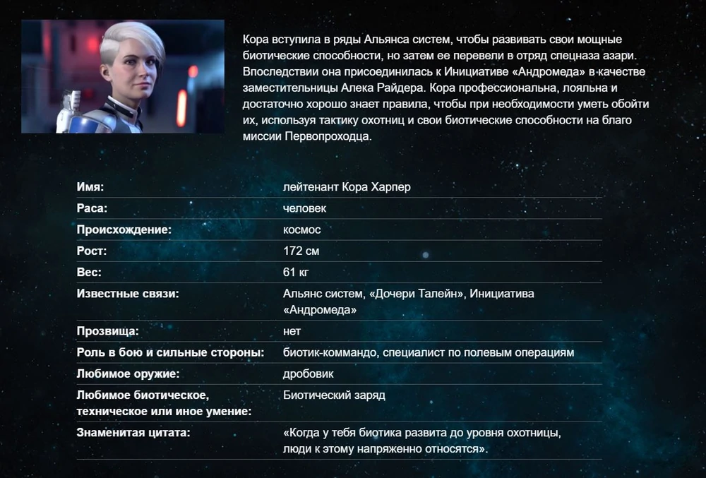 Лейтенант Кора Харпер — биотик и бывший офицер военных сил Альянса. Проведя детство на независимом грузовом корабле, девушка вступила в войска Альянса чтобы развить свои биотические способности. Позже она была переведена из армии по специальной программе под кодовым названием «Валькирия», созданной при участии Совета Цитадели. В рамках этой программы по межвидовой интеграции военных сил Кора присоединилась к подразделению десанта азари «Дочерьми Талейн». Проведя в его составе четыре года, Кора присоединилась к инициативе «Андромеда», последовав совету своего командира Низиры Т’Кош.