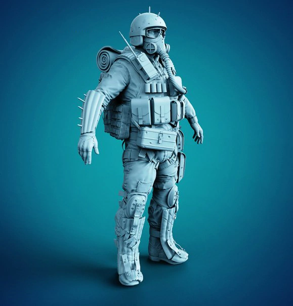 Мужчина примерно 25 лет. Носит респиратор и экипирован в тяжёлую броню штурмовика, а именно: руки и ноги защищены бронепластинами, также, большое количество брони установлено в районе грудной клетки, вместо шлема, на голове капюшон. Сзади находится баллон с кислородом.