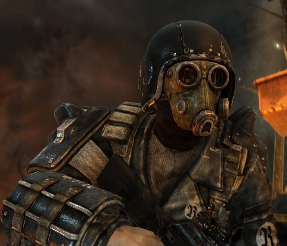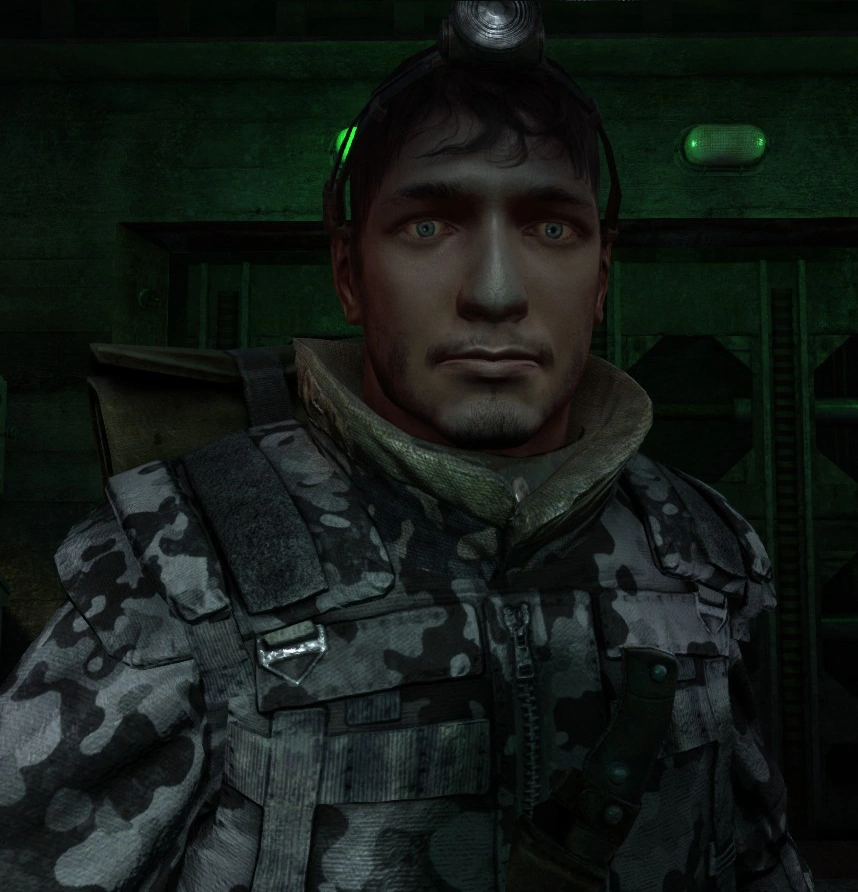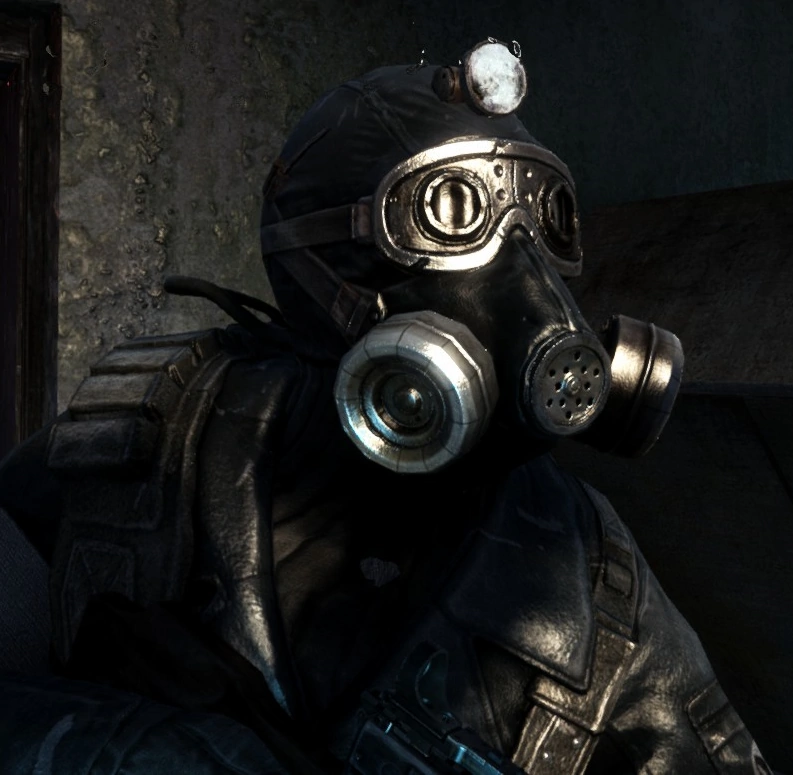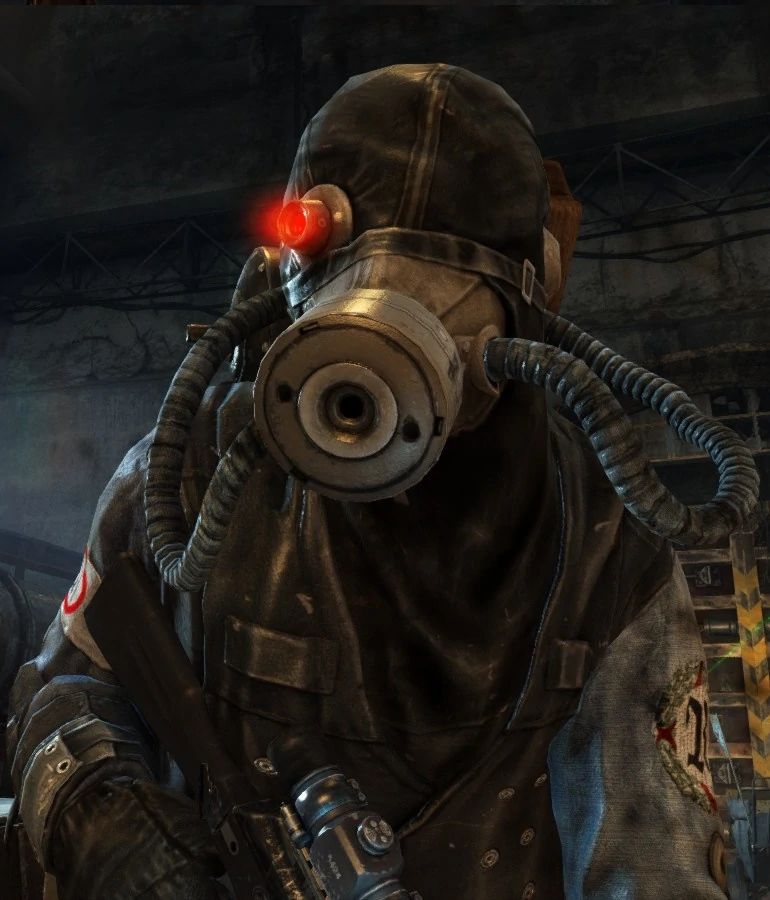Экипирован в одежду обычных жителей московского Метро. Носит каску и противогаз. Не является полноценным солдатом (возможно, рабочий), поэтому не носит усиленной брони и вооружён плохо (Ублюдком, как и его напарник).