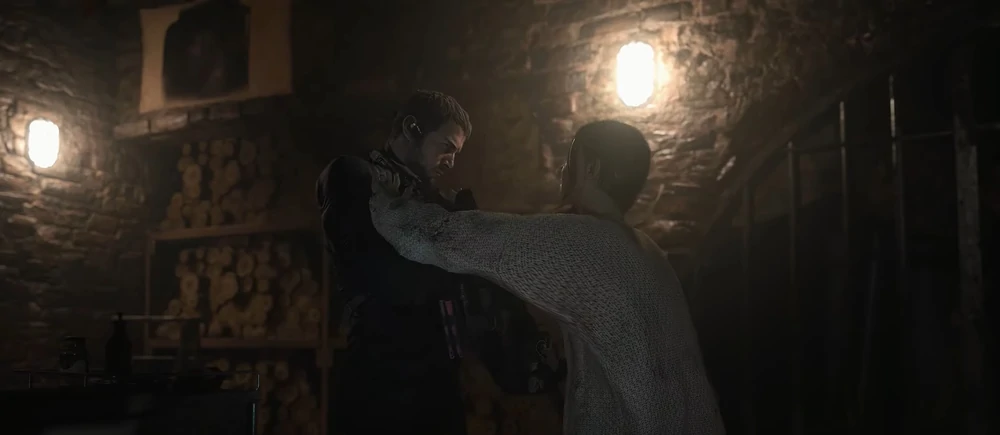 Ребекка притворяется мёртвой, а Вескер, в полной уверенности, что он и Крис теперь остались вдвоем рассказывает ему про исследования, которые стали причиной кошмаров, происходивших в особняке, а так же показывает ему один из плодов этих экспериментов-Тирана (Т-002).