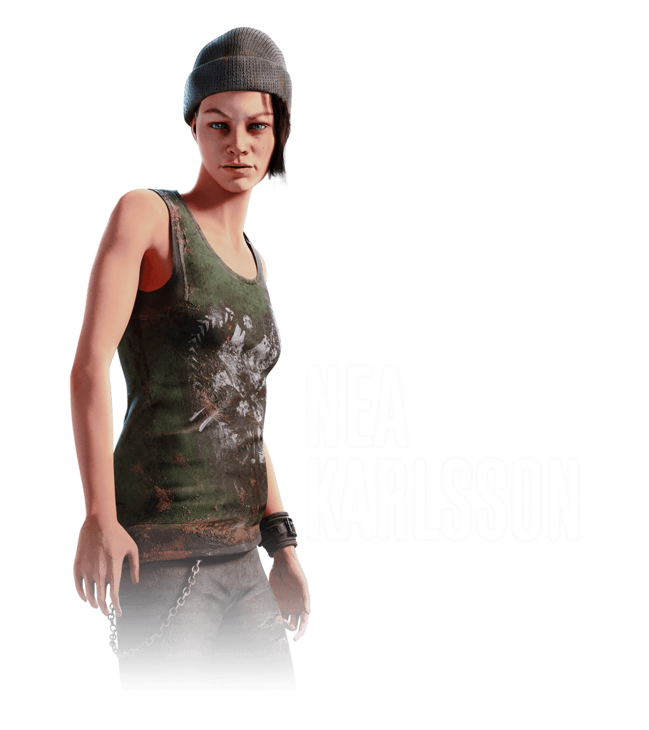Нея Карлссон (англ. “Nea Karlsson“) — один из персонажей игры Dead by Daylight женского пола в роли выжившего. Доступен для выбора сразу после активации бесплатного дополнения “Последний вздох”. Городской художник, способна быстро сбежать и спрятаться.